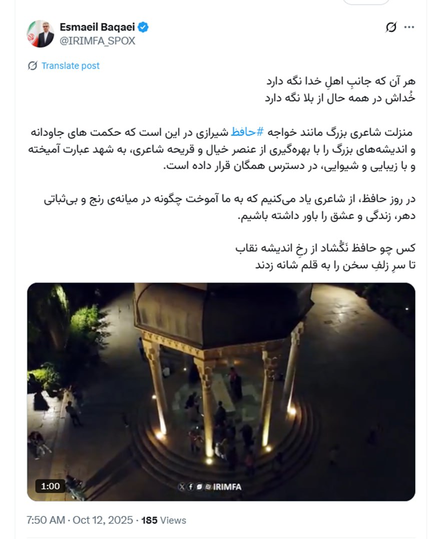 اسماعیل بقائی سخنگوی وزارت امور خارجه در پیامی در شبکه ایکس به مناسبت روز بزرگداشت شاعر بلندآوازه ایرانی، خواجه شمسالدین محمد شیرازی متخلص به «حافظ» و مشهور به لسانالغیب، نوشت: