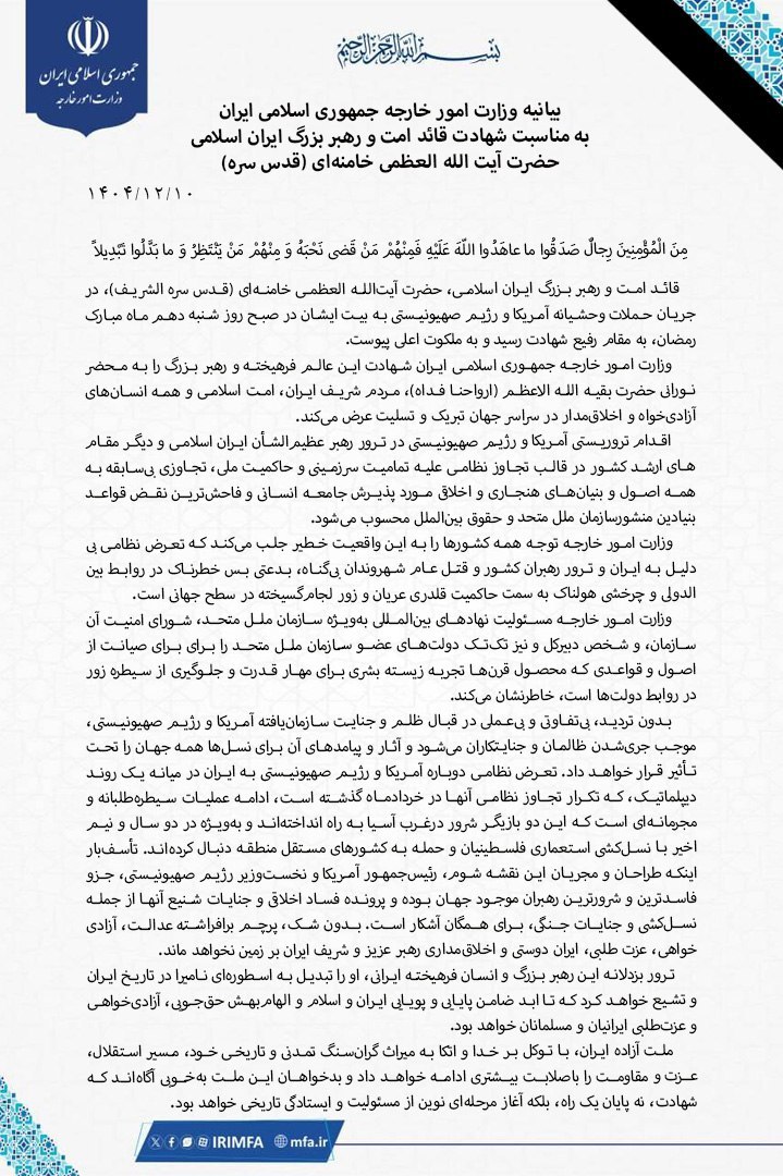 بیانیه وزرات امور خارجه جمهوری اسلامی ایران به مناسبت شهادت قائد امت و رهبر بزرگ ایران اسلامی، حضرت آیتالله العظمی امام خامنهای (قدّس سرّه الشّریف)